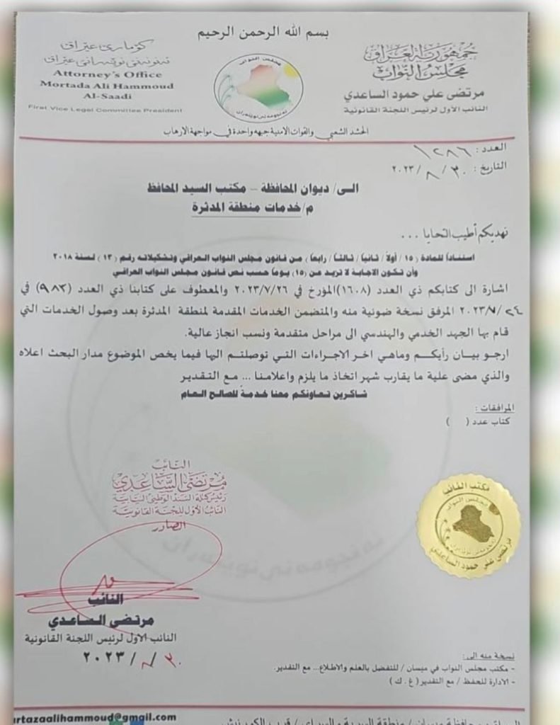 خاطب النائب عن محافظة ميسان “مرتضى الساعدي” ، محافظ ميسان “علي دواي لازم” بشأن حالة الخدمات في منطقة المدثرة بعد ان تم العمل فيها من قبل الجهد الهندسي المرسل من قبل رئيس الوزراء”.