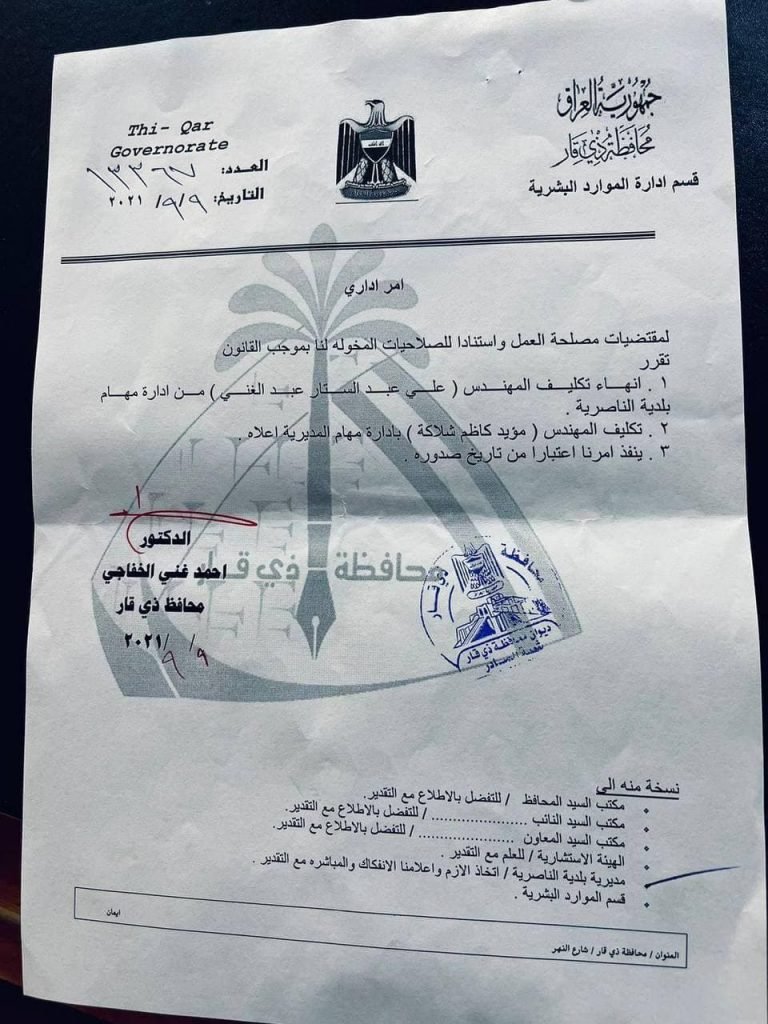 بالوثيقة.. تعيين مدير جديد لبلدية الناصرية وإنهاء تكليف القديم