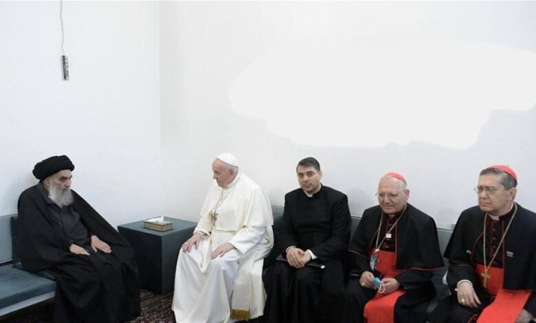 وقالت الوزارة في البيان إنها :”تبارك اللقاء التاريخي بين قطبي السلام، آية الله العظمى سماحة السيد علي السيستاني وقداسة البابا فرنسيس في مدينة النجف الاشرف المقدسة، وتثمن رسائل التسامح والمحبة والدعوة لإرساء دعائم السلام بين كل المكونات والأديان في ارض الرافدين”.