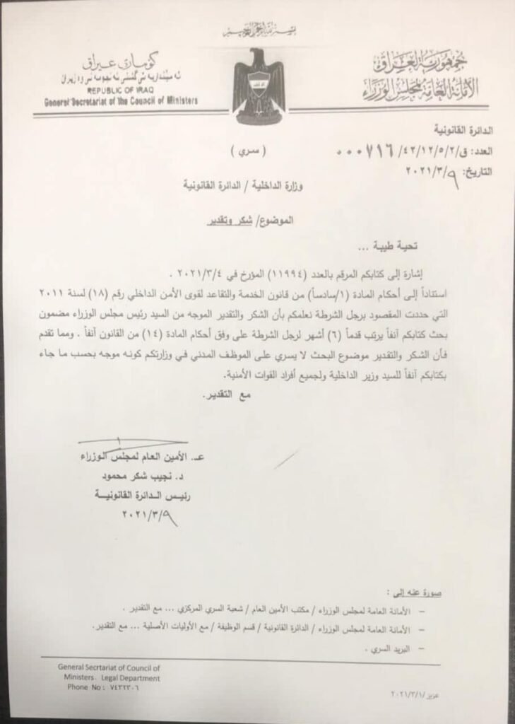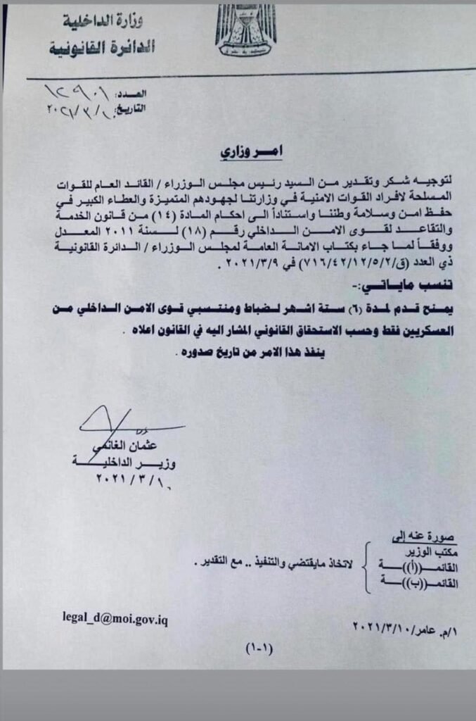 اليوم اردت ان اخاطبك واوصل لك ما يلي بناء على النقاشات والاحتدامات وحالات اللغط الذي ساد تلك الوسائل وأحداث بما يشبه الفتنة الفيسبوكية مابين ابطال منتسبي المؤوسستين الامنية والعسكرية .. وهنا اقصد وزارة الدفاع والداخلية .. فبسبب الكتاب الموجه من الامانة العامة لمجلس الوزراء \ الدائرة القانونية وبرقم ق \ 2 \5\ 12\ 42\ 716 000 في 9\3\2021 والمرفق نسخة منه بناء على كتاب وزارة الداخلية المرقم (11994) في 4\3\2021 المتضمن حول الاستفسار بشكل قانوني بتوجيه سيادتكم بمنح قدما لمدة (6) اشهر لكافة منتسبي وزارة الداخلية (رجل الشرطة ) تحديداوفق احكام المادة (14) من قانون الخدمة والتقاعد لقوى الامن الداخلي رقم (18) لسنة 2011 , والامر الوزاري الموجه من قبل معالي وزير الداخلية برقم 12901 في 10\3\2021المنشور طي مناشدتنا كذلك ..