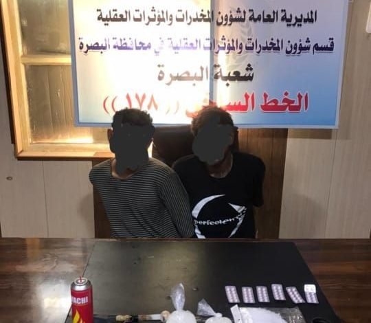 وذكرت المديرية، في بيان ، أن “مفارز المديرية العامة لمكافحة المخدرات والمؤثرات العقلية، ألقت القبض على ( 6 ) متهمين في محافظتي ( البصرة وكربلاء) وبحوزتهم ما يقارب (النصف كيلو غرام) من مادة الكريستال المخدرة إضافة إلى أدوات التعاطي”.