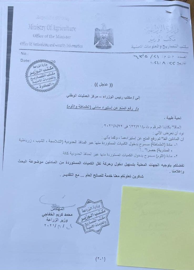 وتم قبل يومين موافقة معالي وزير الزراعة على شمول بعض المواد بالدخول وتم التعميم والعمل يجري بشكل انسيابي في كافة المنافذ الحدودية.