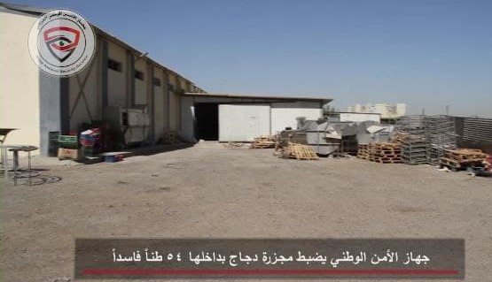 بناءً على المعلومات الواردة عبر الخط الساخن (١٣١) بخصوص وجود مجزرة دجاج غير خاضعة للشروط الصحية في منطقة عويريج الصناعية؛ شرعت المفارز الاقتصادية لجهاز الأمن الوطني بتكثيف جهودها الميدانية ومقاطعة المعلومات، وتمكنت بعد مراقبة استمرت لعدة ايام واستحصال الموافقات القضائية من مداهمة المجزرة وضبط كمية تقدر ب (٥٤) طن من الدجاج المستورد منتهي الصلاحية والممنوع من دخوله للبلد، وكما ان طريقة الخزن غير صحية علاوة على ممارسة الغش الصناعي عبر تغيير علامته التجارية وتعبئته بأكياس أخرى لايهام المواطن بانه منتج محلي وبتاريخ صلاحية جديد.