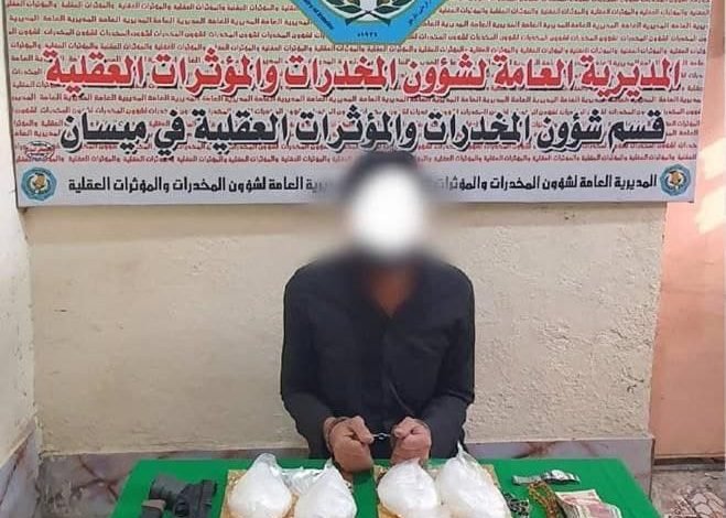 تمكنت مديرية شرطة محافظة ميسان التابعة لوكالة شؤون الشرطة من القبض على أحد تجار المخدرات بالجرم المشهود وبحوزته كمية من مادة الكريستال المخدرة وذلك في سيطرة أمنية جنوب شرق المحافظة .