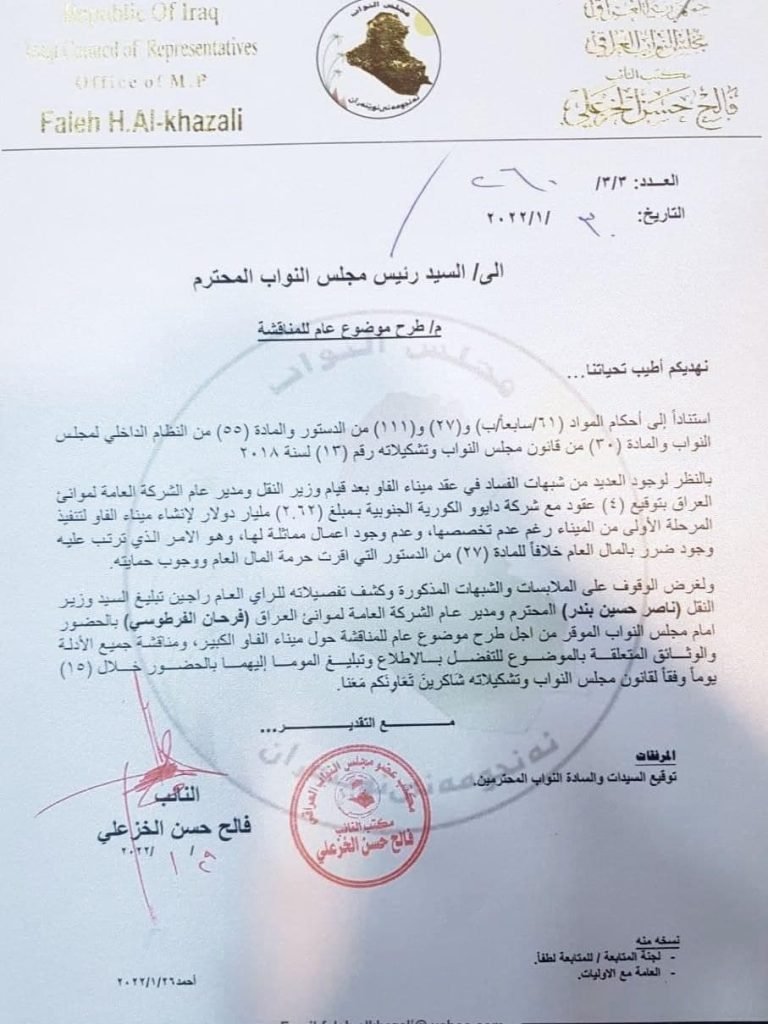 بالوثيقة النائب فالح الخزعلي يطلب بطرح مناقشة ملف ميناء الفاو امام البرلمان لوجود شبهات فساد فيه …