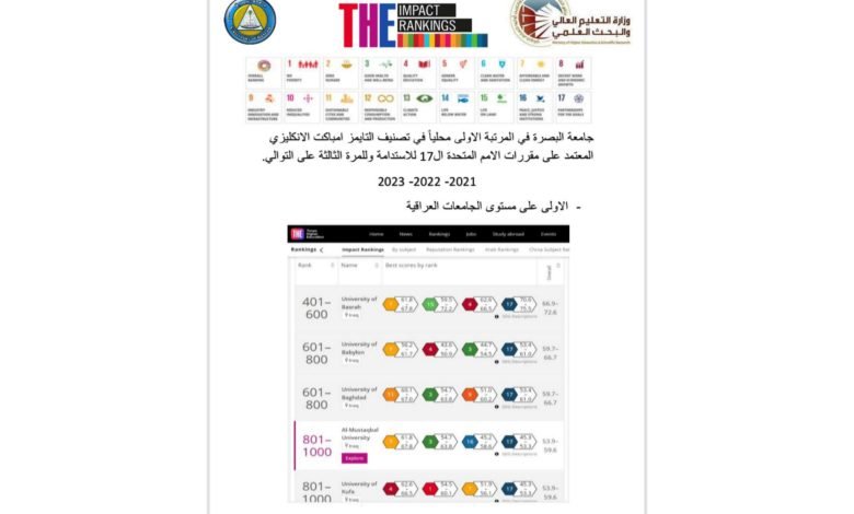 للمرة الثالثة على التوالي .. جامعة البصرة في المرتبة الاولى محليا _تصنيف التايمز امباكت الانكليزي للاستدامة