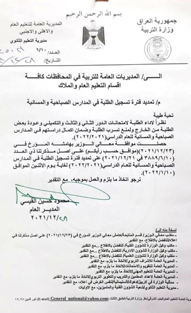 بالوثيقة.. التربية تمدد فترة تسجيل الطلبة في المدارس الصباحية والمسائية