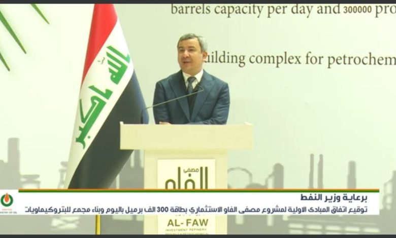 برعاية وزير النفط احسان عبد الجبار توقيع اتفاق المبادى الاولية لمشروع مصفى الفاو الاستثماري بطاقة 300 الف برميل باليوم وبناء مجمع للبتروكيماويات