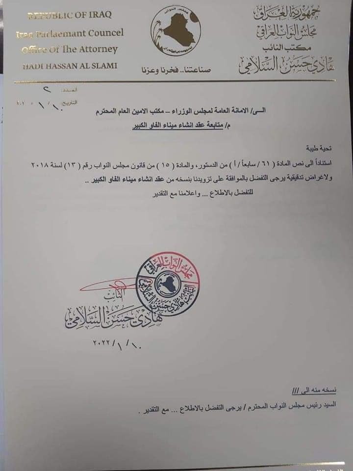 عاجل .. النائب هادي السلامي يطلب من الامانة العامة لمجلس الوزراء ملف عقد ميناء الفاو …
