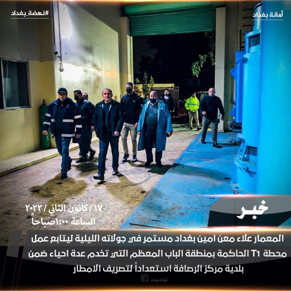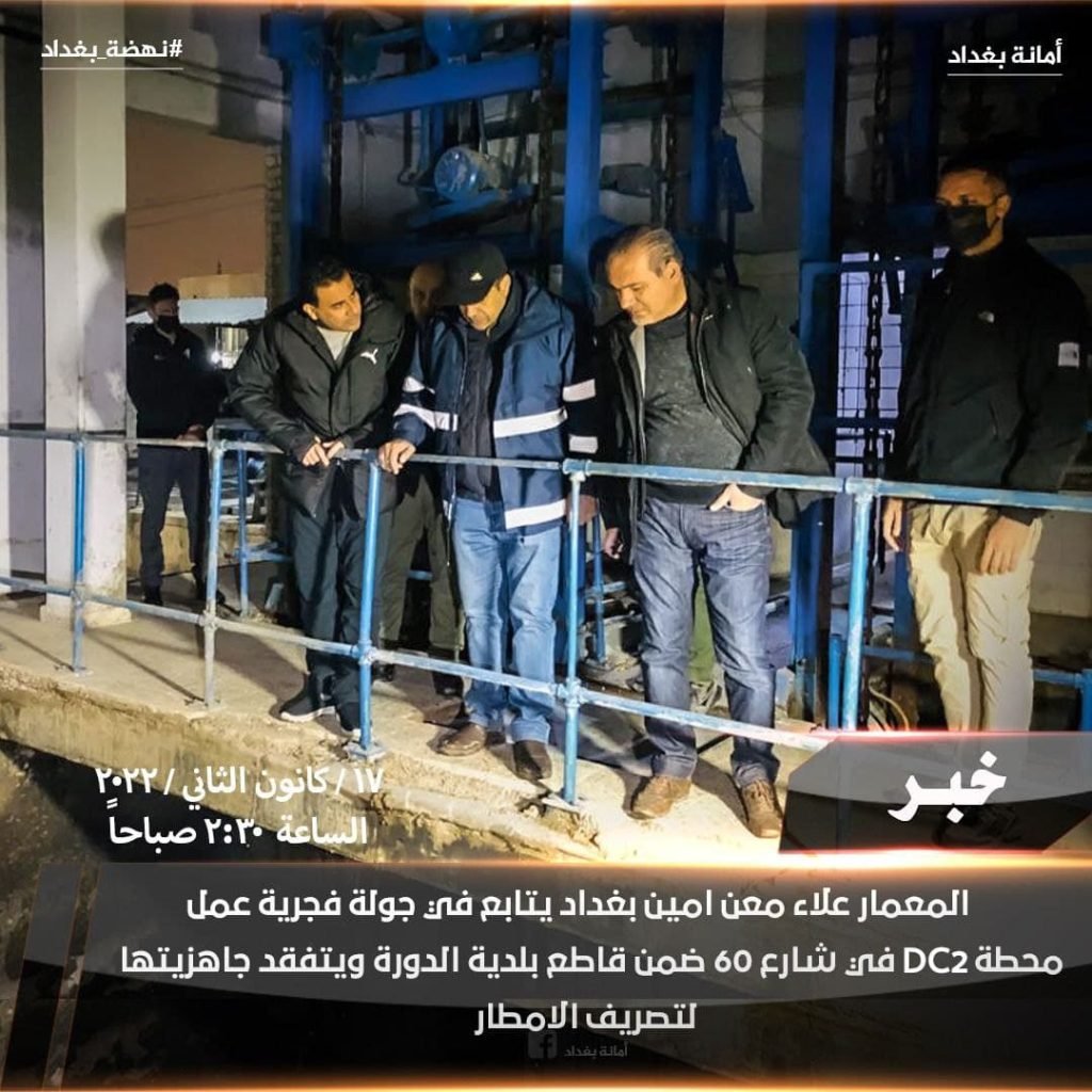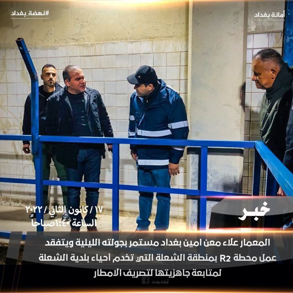 تفقد امين بغداد المعمار علاء معن في جولة مسائية استمرت حتى ساعات الفجر الاولى محطات تصريف مياه الصرف الصحي والامطار بجانبي العاصمة بغداد لمتابعة جاهزيتها لتصريف مياه الامطار .
