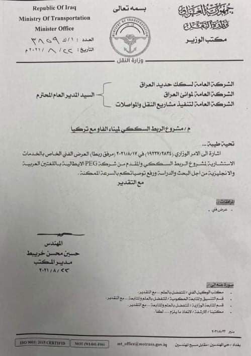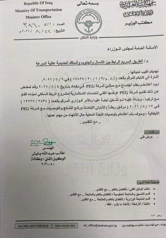 و تضمّنت التوصيات، استثناء إحالـة مشـروع (إعداد دراسات متكاملة لتطوير قطاع السكك الحديدية بالتزامن مع إنشاء ميناء الفاو الكبير إلى شركة (PEG) الإيطاليـة) مـن أساليب التعاقد المنصـوص عليهـا فـي تعليمـات تنفيـذ العقـود الحكوميـة (2 لسنة 2014) والضوابط الملحقة بها، والأساليب المذكورة آنفا في تعليمات تنفيذ الموازنة العامة الاتحادية لحين انتهاء المشروع، استنادا إلى قرار مجلس الوزراء (222 لسنة 2021).
