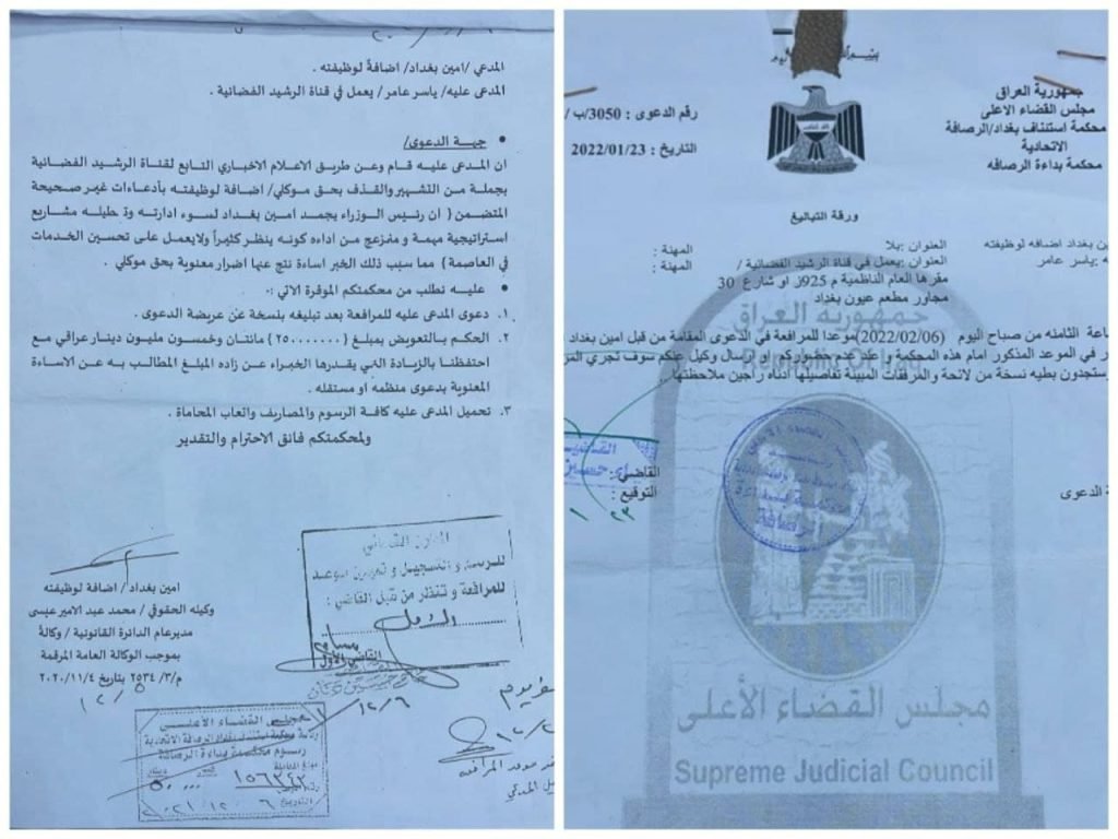 وكان أمين بغداد رفع دعوى قضائية ضد مقدم البرامج في قناة الرشيد الفضائية ياسر عامر أمام محكمة بداءة الرصافة مطالبا بتعويض مالي مقداره ربع مليار دينار عراقي، وتحنل مصاريف الدعوى القضائية واتعاب المحامي، حيث أبلغته المحكمة بالحضور أمامها هو، أو محام ينوب عنه في السادس من فبراير الجاري.
