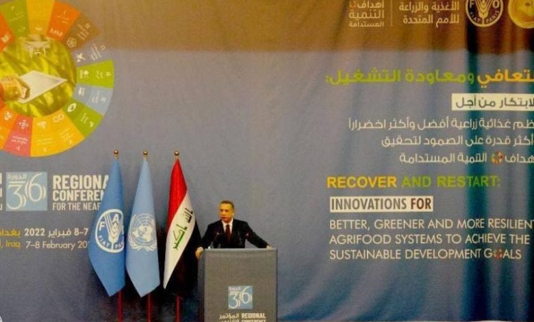 وقال الكاظمي في كلمته خلال حضوره المؤتمر الإقليمي {36} للشرق الأدنى وشمال أفريقيا بالتعاون مع منظمة {فاو} المنعقد لأول مرة في العاصمة بغداد وأنطلقت أعماله اليوم :”أرحّب بكم في العراق، متمنياً النجاح لهذا المؤتمر في تحقيق غاياته وأهدافه، وأن يكون منطلقاً للمزيد من التعاون والشراكة في مجالات الأغذية والزراعة، وبما يحقق أهداف منظمة (فاو) في خدمة المجتمعات”.