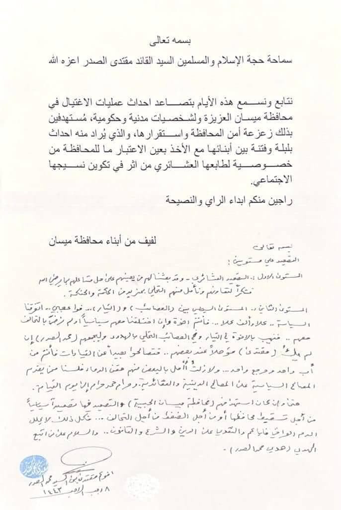 الصدر يدعو جهتين لتهدئة الاوضاع في ميسان