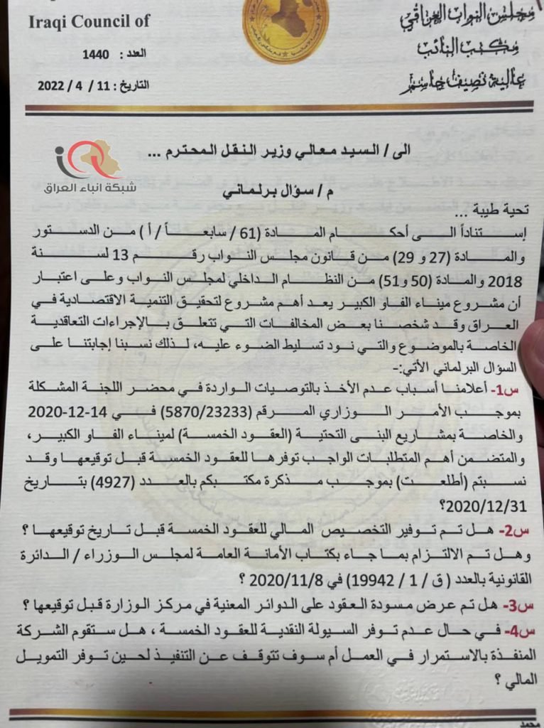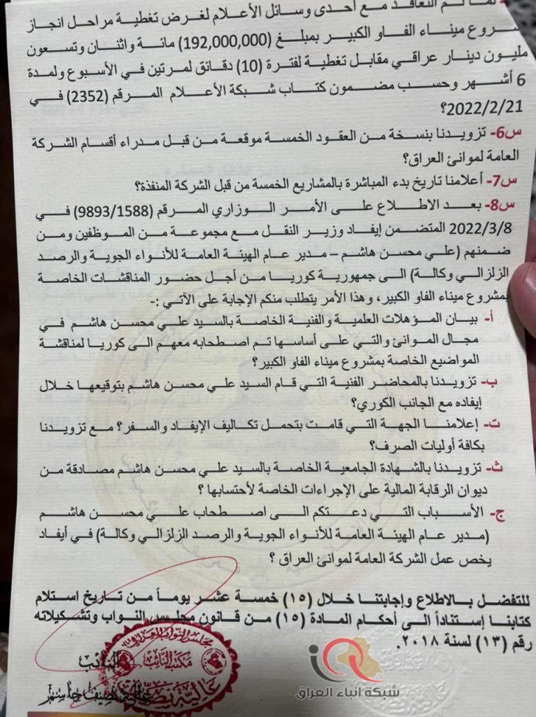 وجاء في الأسئلة أنه :” بعد الإطلاع على الأمر الوزاري المرقم (1588/9893) في 8/3/2022 المتضمن إيفاد وزير النقل مع مجموعة من الموظفين (ومن ضمنهم مدير عام هيئة الأنواء الجوية والرصد الزلزالي وكالة) الى جمهورية كوريا لحضور المناقشات الخاصة بمشروع ميناء الفاو، نطلب بيان المؤهلات العلمية والفنية الخاصة بمدير الأنواء الجوية في مجال الموانئ والتي على أساسها تم اصطحابه معهم الى كوريا، وتزويدنا بالمحاضر الفنية التي قام بتوقيعها مع كوريا، وإعلامنا بالجهة التي قامت بتحمل تكاليف الإيفاد والسفر، مع تزويدنا بأوليات الصرف، والشهادة الجامعية الخاصة بمدير عام الأنواء الجوية مصادقة من قبل ديوان الرقابة المالية على الإجراءات الخاصة لاحتسابها، والأسباب التي جعلت الوزير يصطحبه في إيفاد يخص عمل الشركة العامة لموانئ العراق “.