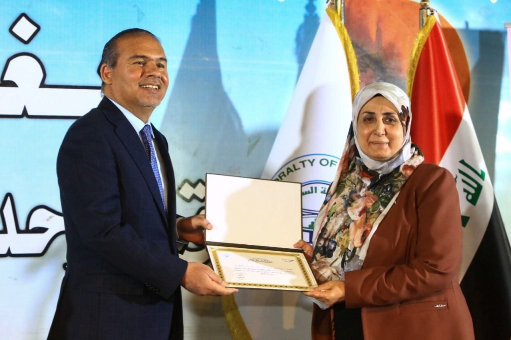 كرم أمين بغداد المعمار علاء معن النساء العاملات في امانة بغداد في احتفال رسمي بمناسبة يوم المرأة العالمي .