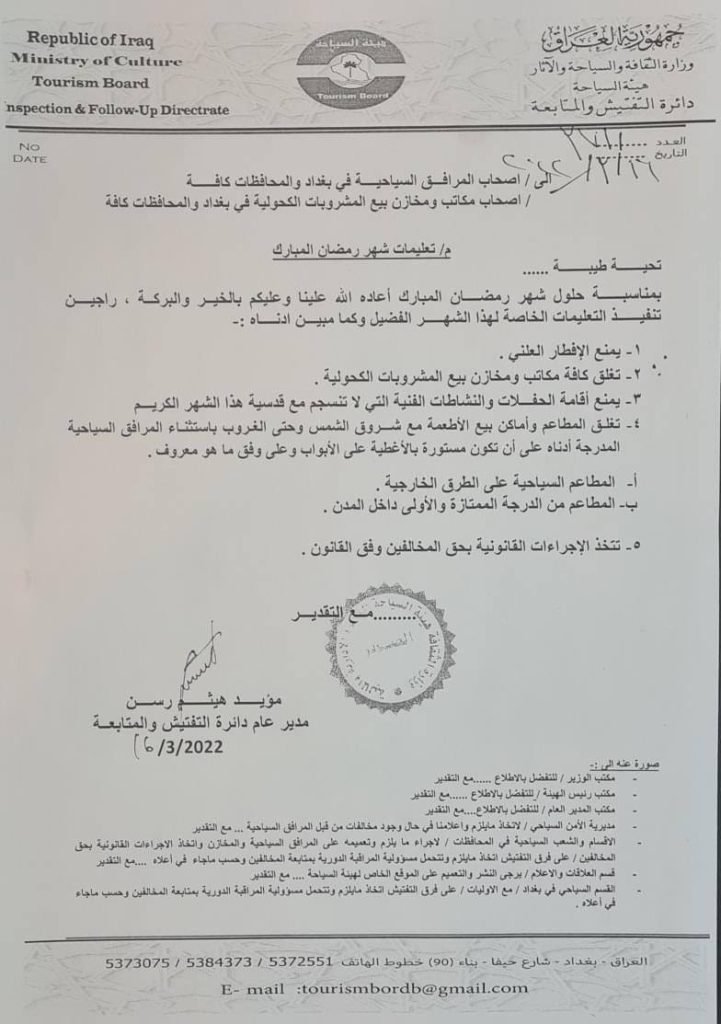 اصدرت هيئة السياحة / دائرة التفتيش والمتابعة /احدى تشكيلات وزارة الثقافة والسياحة والاثار، اليوم الاثنين، تعليمات جديدة لاصحاب محال بيع المشروبات الكحولية والمطاعم من مختلف الدرجات خلال ايام شهر رمضان المبارك”.
