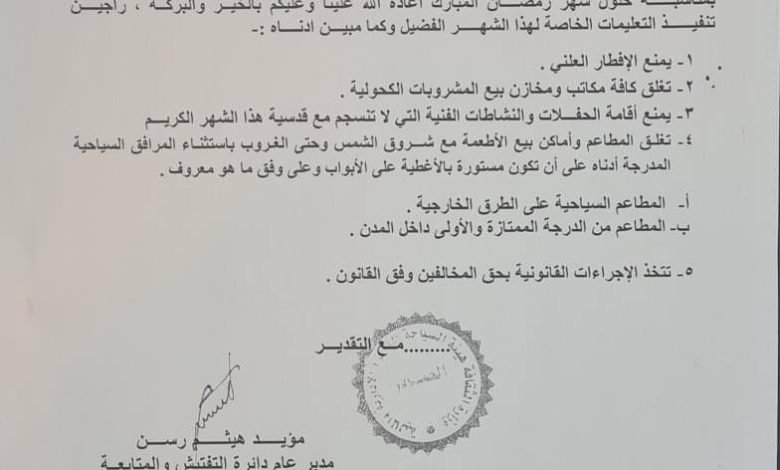 وذكرت الوثيقة بمنع “بيع المشروبات الكحولية خلال شهر رمضان واغلاق المحال بشكل كامل.