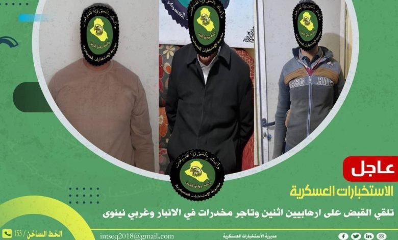 خلية الإعلام الأمني : الاستخبارات العسكرية تلقي القبض على ارهابيين اثنين وتاجر مخدرات وتضبط اعتدة في محافظتي الانبار وغربي نينوى