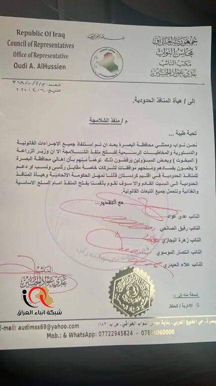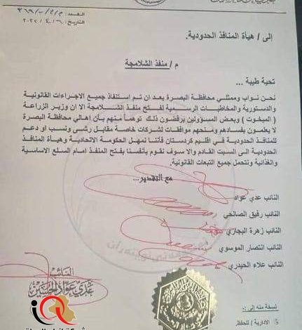 نواب البصرة يمهلون حكومة تصريف الاعمال الى يوم السبت المقبل لفتح منفذ الشلامجة الحدودي وبعكسه سيتم فتح المنبر من قبلهم ..