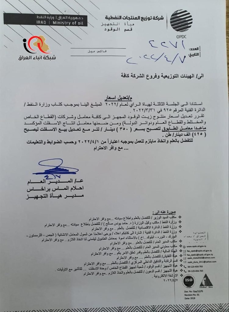 وبحسب وثيقة ، فقد “قررت شركة توزيع المنتجات النفطية تعديل اسعار منتوج زيت الوقود المجهز الى كافة معامل وشركات (القطاع الخاص والمختلط والقطاع العام ودوائر الدولة) ومن ضمنها معامل انتاج الاسفلت المؤكسد ما عدا معامل الطابوق لتصبح بسعر (350) دينار/ لتر”.