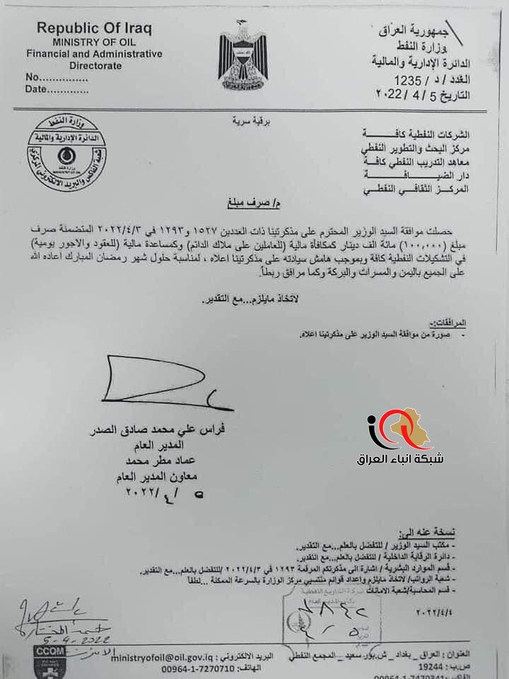 بالوثيقة.. النفط تصرف “عيدية” 100 ألف دينار الى موظفيها