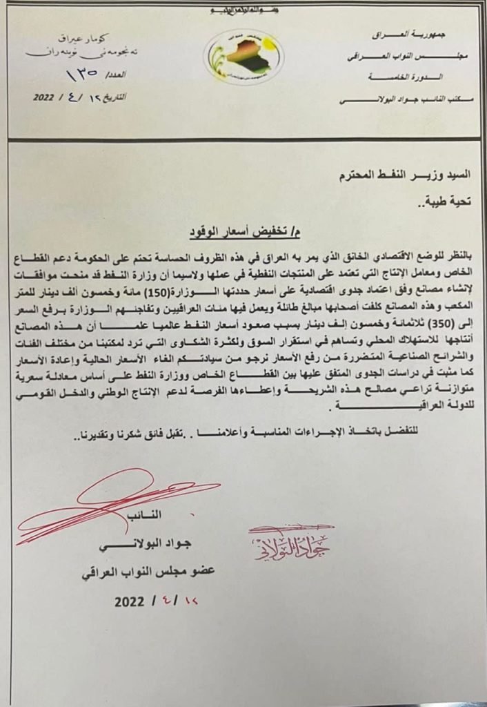 دعا النائب جواد البولاني وزارة النفط الى العودة باسعار النفط الاسود الى السابق واضاف بحسب كتاب تم توجيهه الى وزير النفط انه من الضروري تخفيض اسعار النفط الاسود الى ١٥٠ الف وهو السعر السابق بدل من ٣٥٠ الف كون هذا الزيادة اثرت بشكل كبير على العديد من القطاعات والفئات سيما العاملين في معامل الاسفلت المؤكسد الذين تم تسريح عدد كبير منهم بسبب هذه الزيادة.