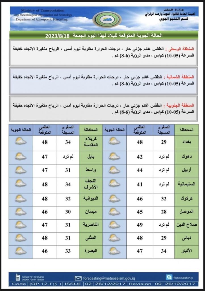 أعلنت الهيئة العامة للانواء الجوية والرصد الزلزالي، اليوم الجمعة، توقعاتها لحالة الطقس ودرجات الحرارة في عموم مناطق البلاد.