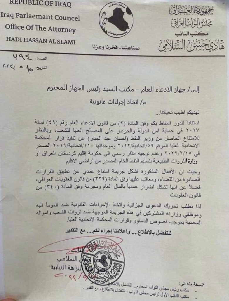 النائب المستقل هادي السلامي يوجه كتاب الى الادعاء العام من اجل تحريك دعوى جزائية ضد وزير نفط حكومة الكاظمي (احسان عبدالجبار)بسبب عدم تطبيق القانون من قبل الوزير اتجاة اقليم كردستان بخصوص نفط الاقليم