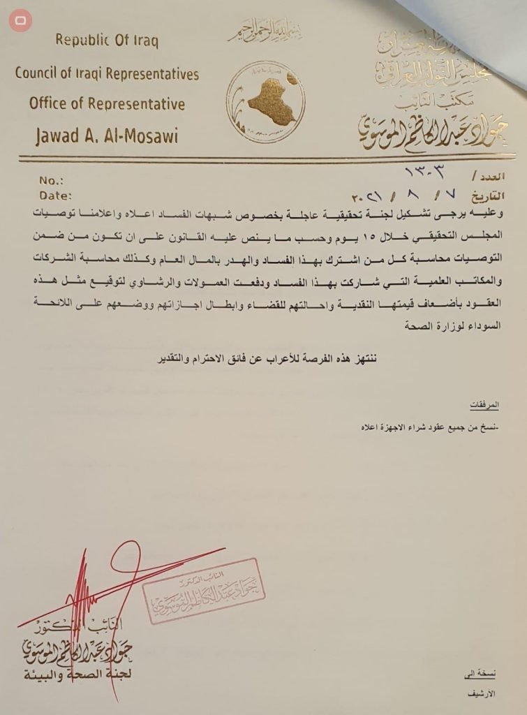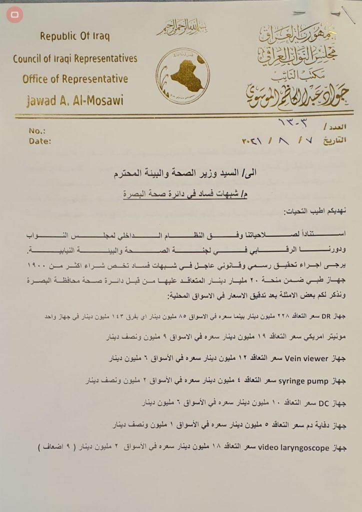 جاء ذلك خلال وثيقة وردت للسومرية نيوز، مرسلة من الموسوي الى وزارة الصحة، حيث يقول فيها، “استنادا لصلاحياتنا وفق النظام الداخلي لمجلس النواب ودورنا الرقابي في لجنة الصحة والبيئة النيابية، يرجي اجراء تحقيق رسمي وقانوني عاجل في شبهات فساد تخص شراء اكثر من 1900 جهاز طبي ضمن منحة 20 مليار دينار المتعاقد عليها من قبل دائرة صحة محافظة البصرة”.