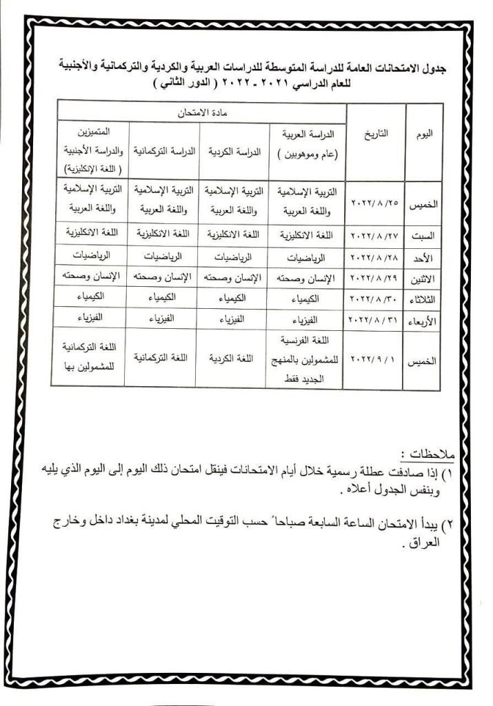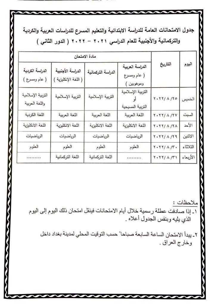أعادت وزارة التربية، نشر جدول الامتحانات العامة (الدور الثاني) للدراستين الابتدائية والمتوسطة للعام الدراسي 2021 – 2022.