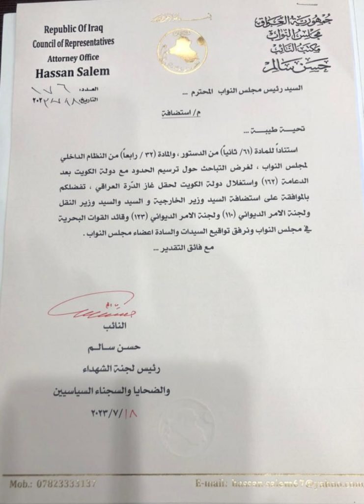 النائب حسن سالم يجمع تواقيع نيابية لغرض استضافة السادة وزراء ( الخارجية والنقل ) ولجنتي الامر الديواني (110 و123) وقائد القوات البحرية لمناقشة موضوع ترسيم الحدود مع الكويت.
