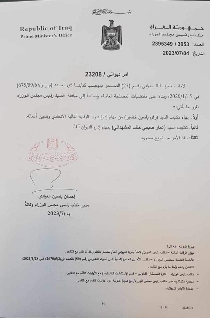 واظهرت وثيقة صادرة عن مجلس الوزراء بتاريخ اليوم موافقة رئيس الوزراء محمد السوداني على انهاء تكليف رافل ياسين خضير من مهام إدارة ديوان الرقابة المالية الاتحادي وتكليف عمار صبحي المشهداني بمهام ادارة الديوان.