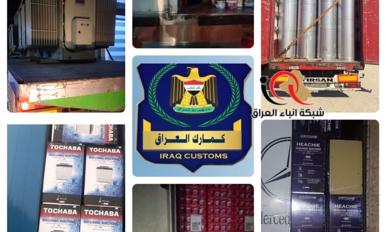 مديرية كمرك المنطقة الشمالية متمثلة بقسم التحري و مكافحة التهريب تضبط ( ١٢ ) شاحنة محملة ( غسالات كهربائية و اجزاء معمل و محولات كهربائية و مواد غذائية و اجزاء تبريد مركزي و كاربونات الكالسيوم) مخالفة للشروط و الضوابط النافذة .
