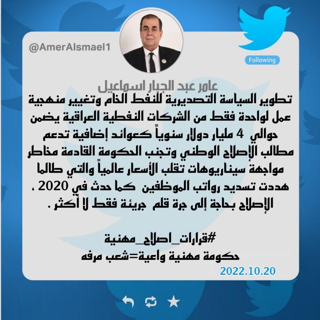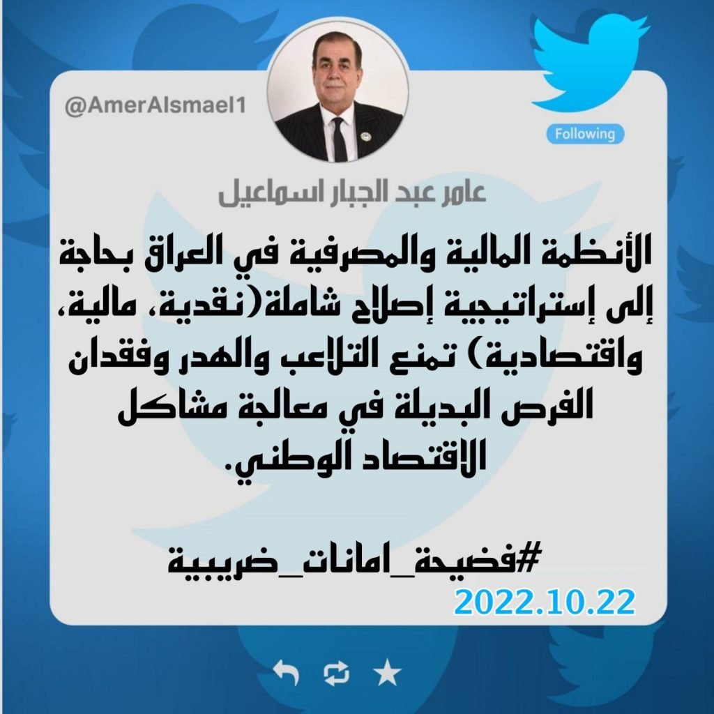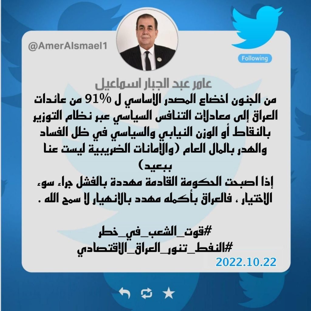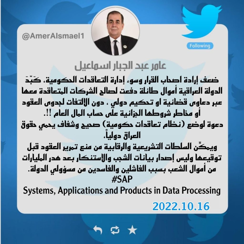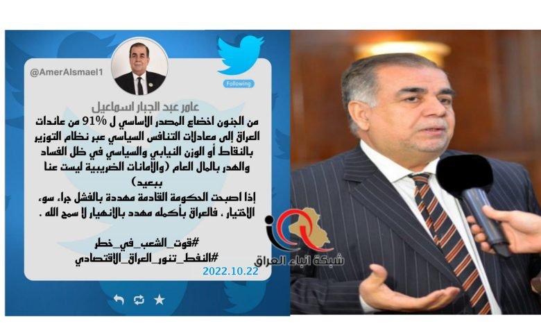 خمسة تغريدات للخبير الوطني المتمرس النائب عامر عبد الجبار ترسم خارطة طريق لمعالجة نصف مشاكل الدولة
