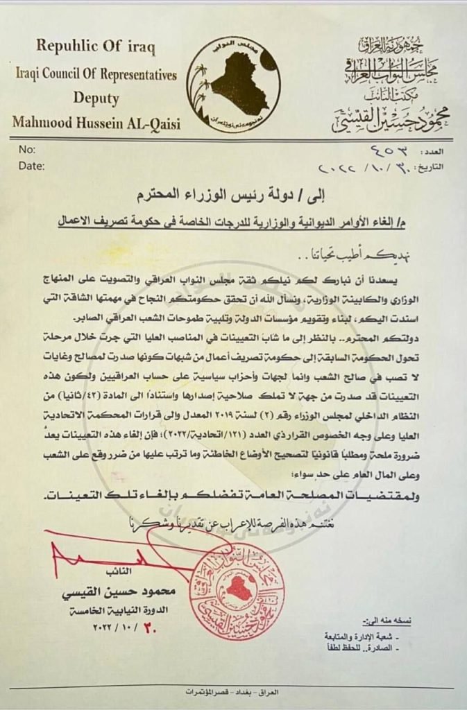 وبحسب وثيقة صادرة عن القيسي ، إنه “بالنظر الى ما شاب التعيينات في المناصب العليا التي جرت خلال مرحلة تحول الحكومة السابقة الى حكومة تصريف اعمال من شبهات كونها صدرت لمصالح وغايات لا تصب في صالح الشعب وانما لجهات وأحزاب سياسية على حساب العراقيين”.