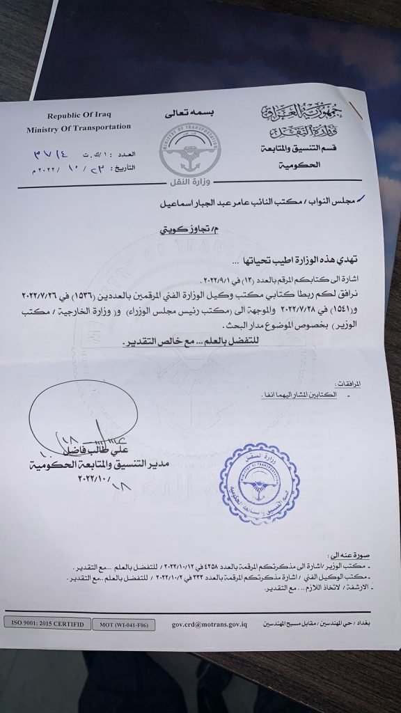 واليوم قد ورد الى مكتب النائب كتاب وزارة النقل المرقم 3714 الصادر بتاريخ 2022.10.24 ردا على كتاب النائب عبد الجبار اعلاه وقد اكدت وزارة النقل بصحة ودقة معلومات بلاغه ولكن الغريب بان وزارتي الخارجية والدفاع لم يصدر منهما اي رد لحد الان !!