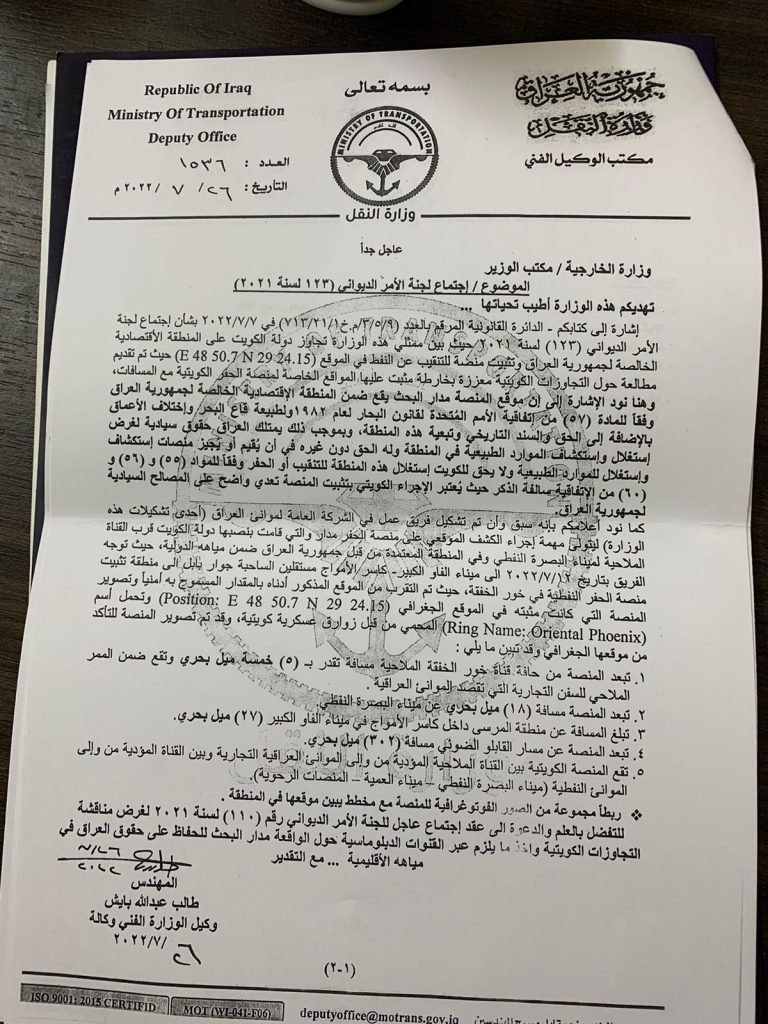 الخارجية والنقل والدفاع والمرقم 13 بتاريخ 2022.09.01 والذي أكَّد فيه على كتابه السابق وذكر فيه بان الكويت سبق لها وان تجاوز على بإنشاء منصة بحرية قرب كاسر امواج ميناء الفاو الكبير وقد شوهدت مؤخرا بتطويرها وبناء منشآت جديدة عليها