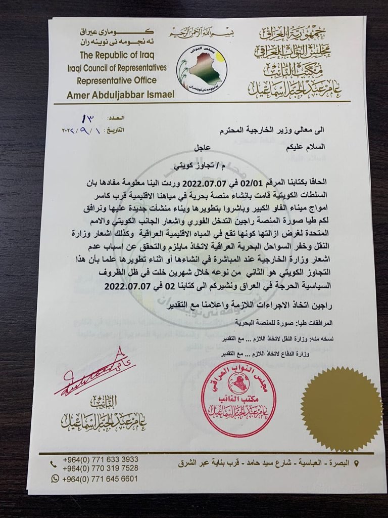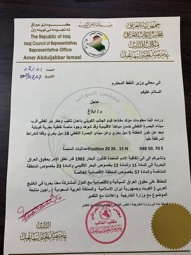 صرَّح النائب الخبير المهندس عامر عبدالجبار اسماعيل بانه ارسل كتاب ابلاغ الى وزارتي النفط والخارجية والمرقم 02/01 بتاريخ 2022.07.07 على تجاوز كويتي ضمن مياهنا الاقليمية وقد شوهد وجود منصة نفطية بحرية كويتية تبعد عن خور الخفگة 5 ميل بحري وعن ميناء البصرة النفط 18 ميل بحري وقد حدد الخبير المهندس موقع المنصة بخطوط الطول والعرض