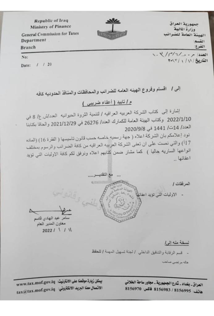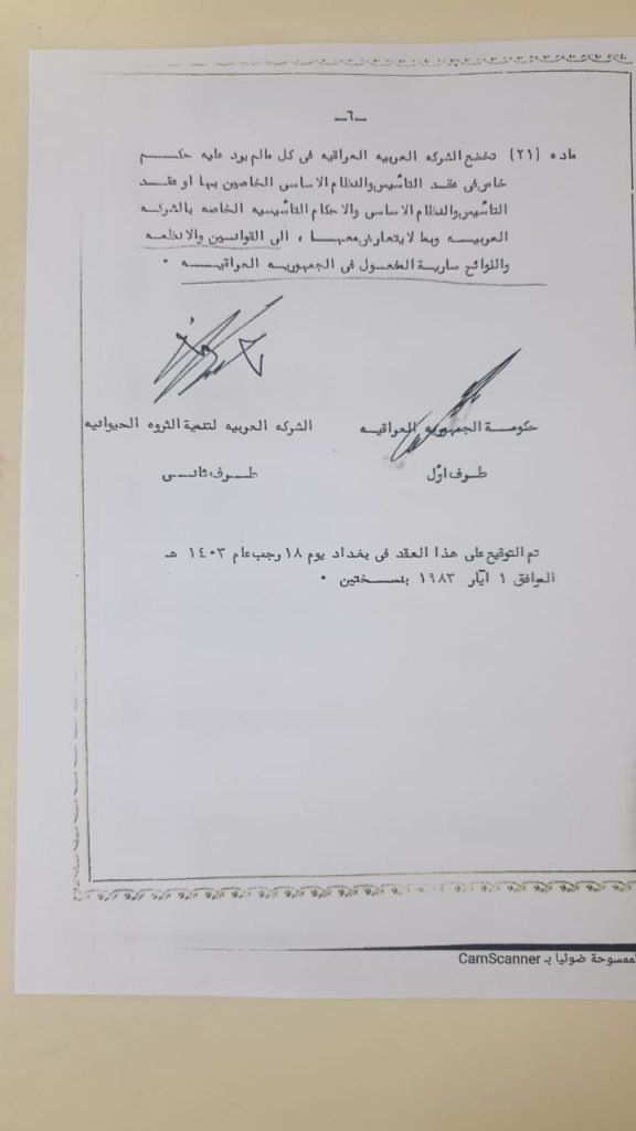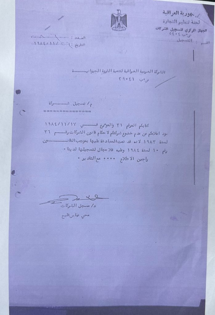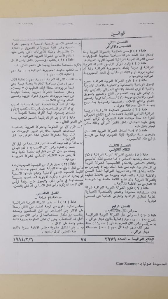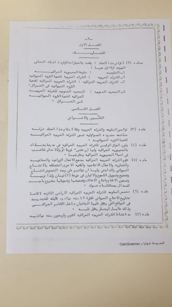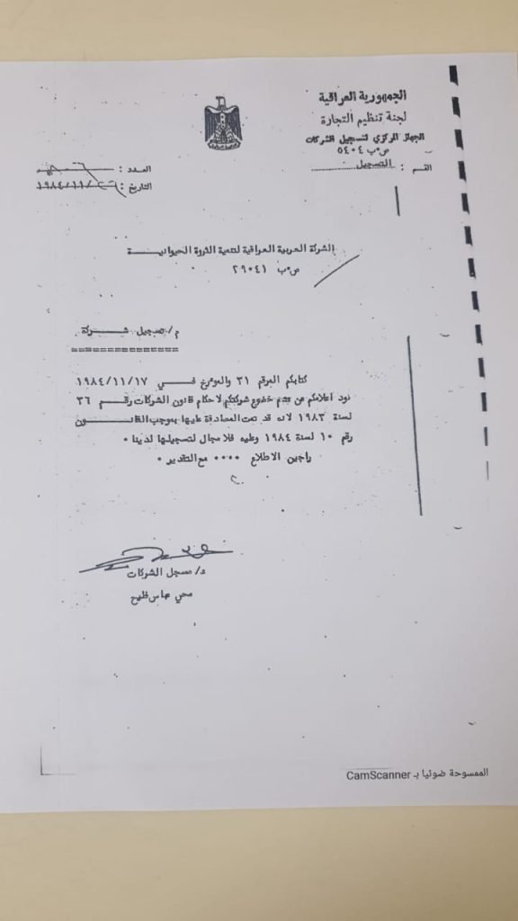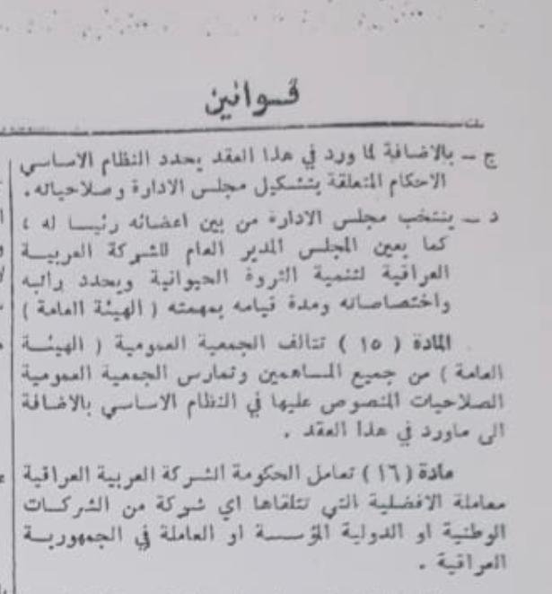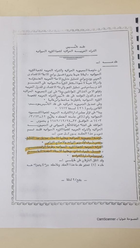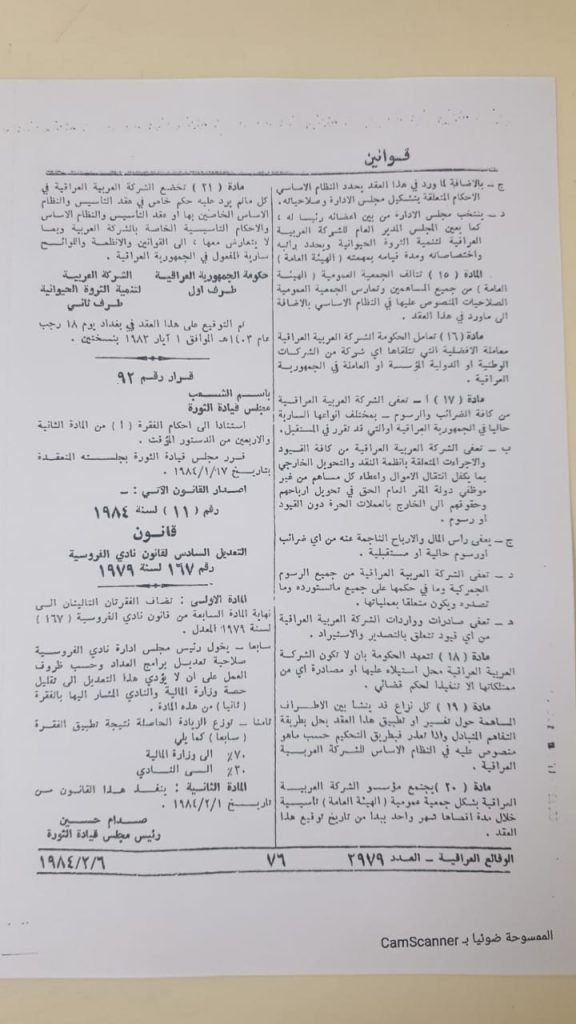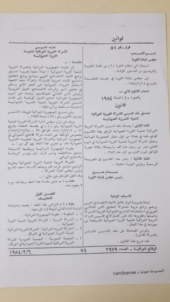في عام 1984 صدر قانون تأسيس الشركة العربية العراقية لانتاج الثروة الحيوانية وهي شركة عربية عراقية تنفيذا لتوصيات جامعة الدول العربي من اجل التعاون في توفير الامن الغذائي العربي، وتسهيلا لعمل هذه الشركة فقد منحت بموجب هذا القانون وبمواد صريحة واضحة، الكثير من التسهيلات في العمل والاعفاءات الكمركية في الاستيراد والتسجيلات الادارية من اجل توفير المواد الرئيسة في قوت المواطن باسعار ميسّرة معتدلة بعيدا عن جشع السوق التجاري ومضارباته.