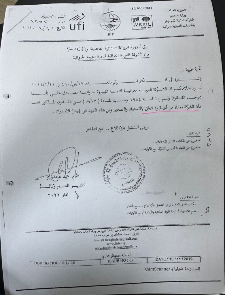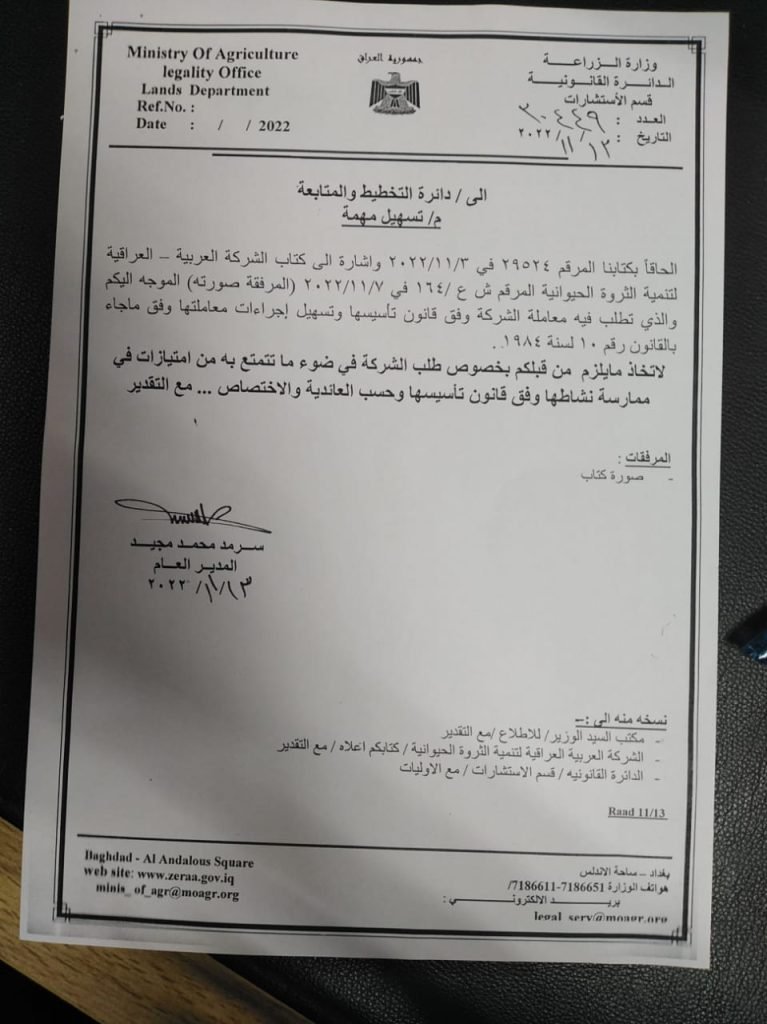 نرفق لدولتكم طي هذا الطلب قانون تأسيس الشركة النافذ ذا العدد 10 الصادر في عام 1984 والمعزز برأي واقرار مجلس شورى الدولة في عام 2021. ونرفق كذلك الادعاءات الباطلة التي يثيرها النواب البرلمانيون الفاسدون المبتزون في وسائل الاعلام لتوضيح ماورد في طلبنا هذا امام دولتكم، ونشير ايضا وبيقين راسخ ان التحقيق سيكشف ممارسات كمركية خارجة عن القانون كان يمارسها هؤلاء النواب في استصدار رخص واعفاءات كمركية استثنائية من رئاسة الوزراء السابقة كنوع من التخادم السياسي المتبادل، وهو السبب الرئيس كما نعتقد في استقواء هؤلاء على المؤسسات الحكومية والخاصة.