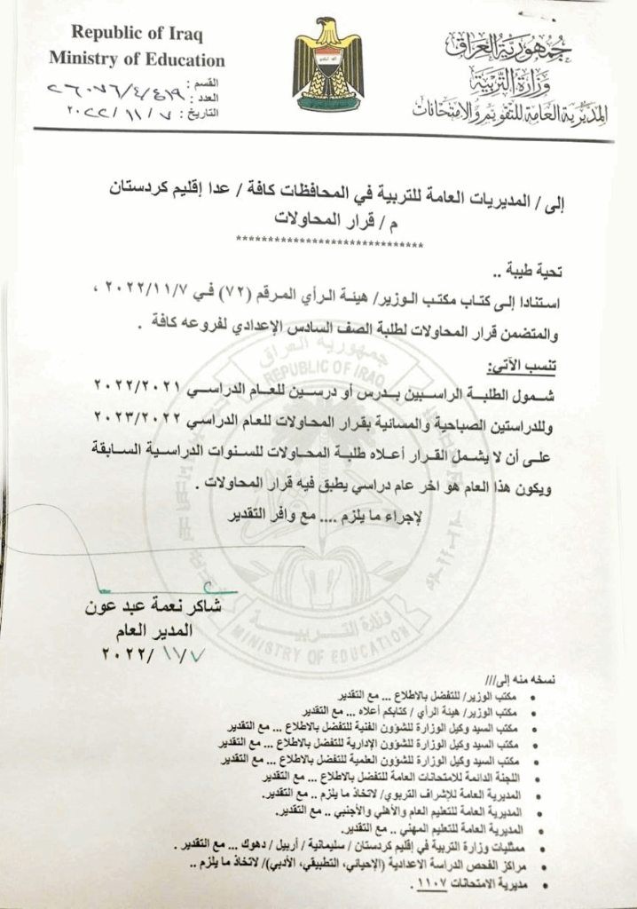 أعلنت وزارة التربية، ، تعليمات قرار “المحاولات” لطلبة الصف السادس الاعدادي لفروعه كافة.