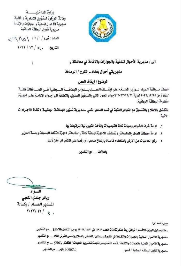 وبحسب وثيقة : “حصلت موافقة وزير الداخلية على إيقاف العمل بدوائر البطاقة الوطنية في المحافظات كافة لفترة من تاريخ 25/12/2022 لغاية 31/12/2022؛ لأجراء الجرد المالي والتدقيق السنوي، بالإضافة الى اجراء الادامة على أجهزة منظومة البطاقة الوطنية”.