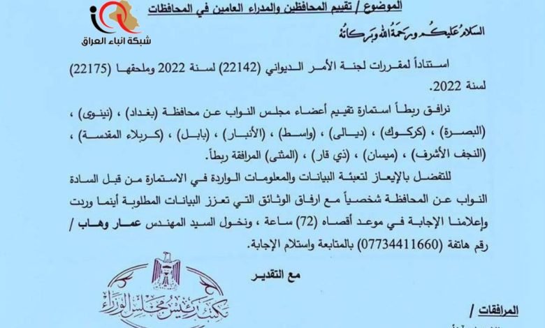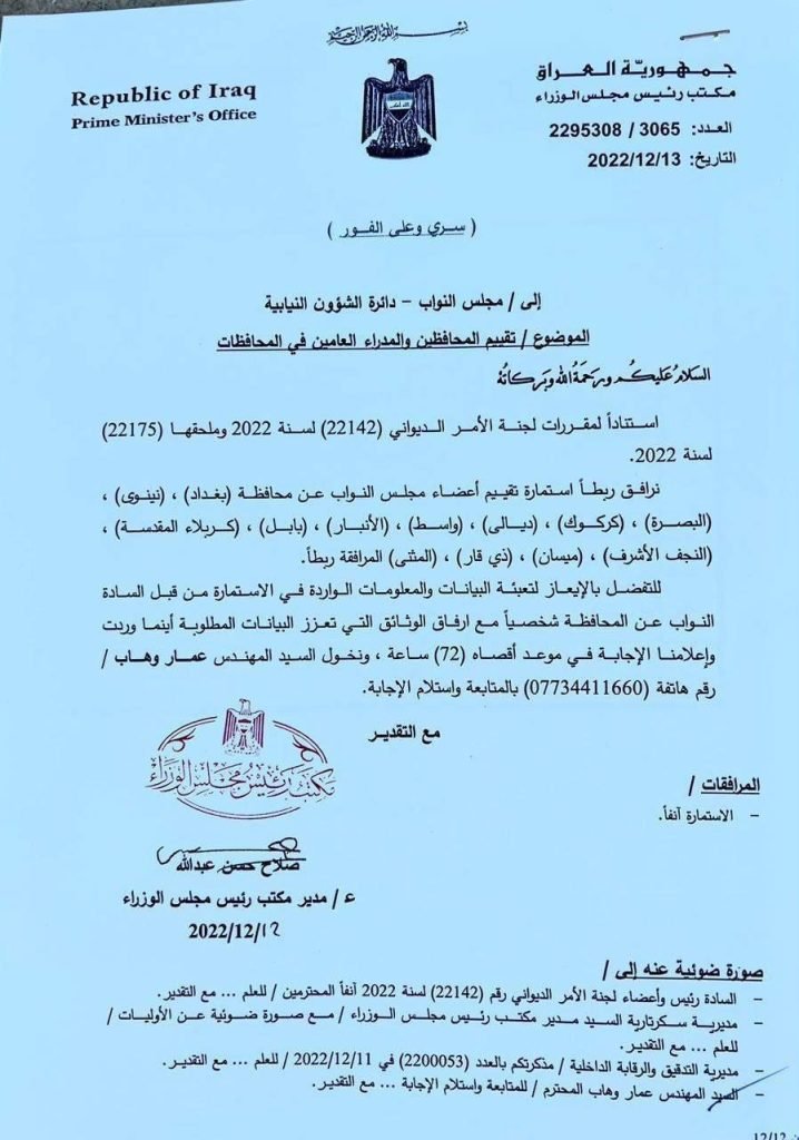 بالوثيقة السرية .. مجلس الوزراء يخاطب مجلس النواب بشأن تقييم المحافظين و المدراء العامين في المحافظات.