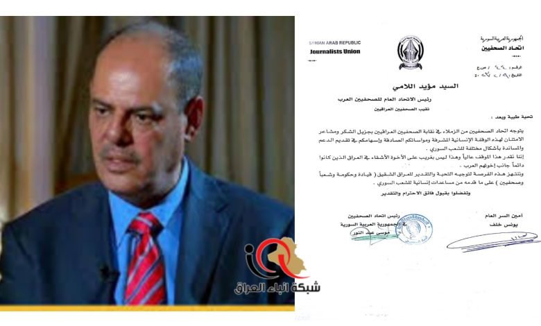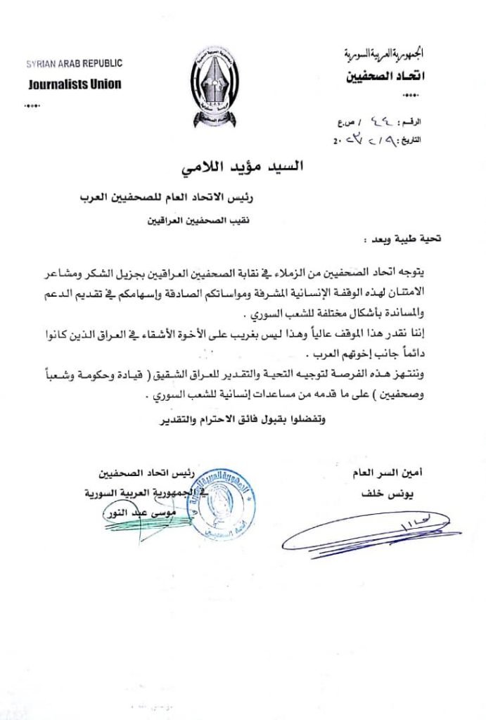 بالوثيقة : رئيس اتحاد الصحفيين في سوريا يشكر السيد اللامي رئيس اتحاد الصحفيين العرب نقيب الصحفيين العراقيين .. على موقف العراق الانساني تجاه اخوانهم في سوريا على اثر الزلزال الذي اصاب البلد الشقيق …