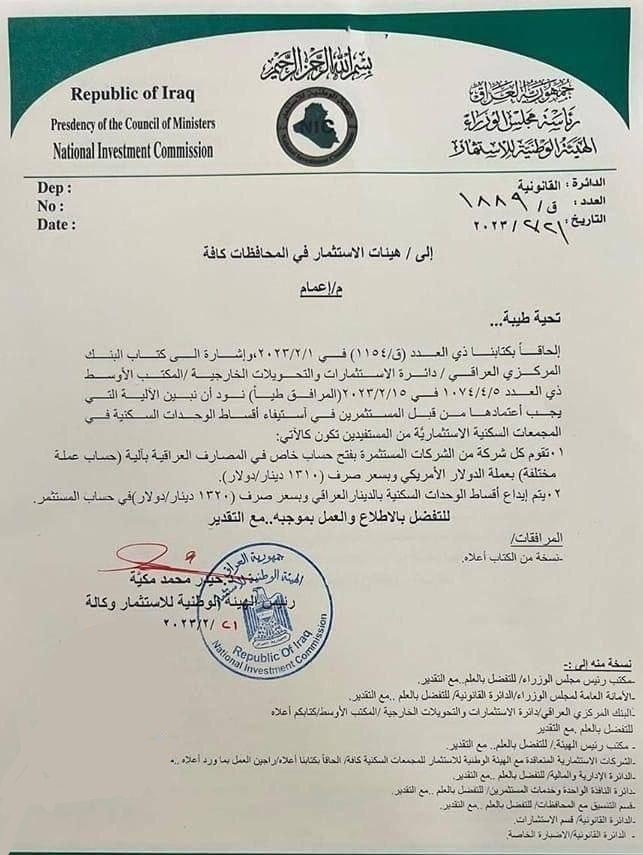 بالوثيقة .. توجيه هيئة الاستثمار بشأن استيفاء أقساط الوحدات السكنية بالدينار العراقي ..