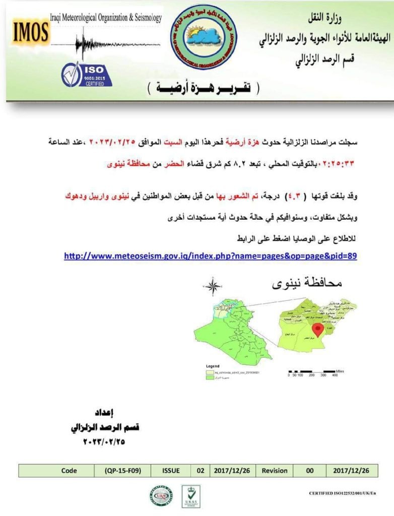 وأضاف البيان، ان “الهزة الأرضية سجلت في تمام الساعة 02:25:33 فجر هذا اليوم بالتوقيت المحلي وتبعد (8،5) كم شرق قضاء الحضر من محافظة نينوى “، مؤكدة أنه “تم الشعور بها من قبل المواطنين في نينوى واربيل ودهوك وبشكل متفاوت ولم تردنا اي خسائر تذكر”.