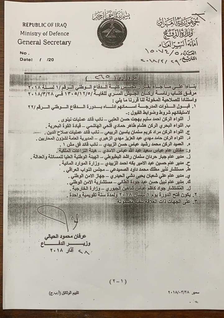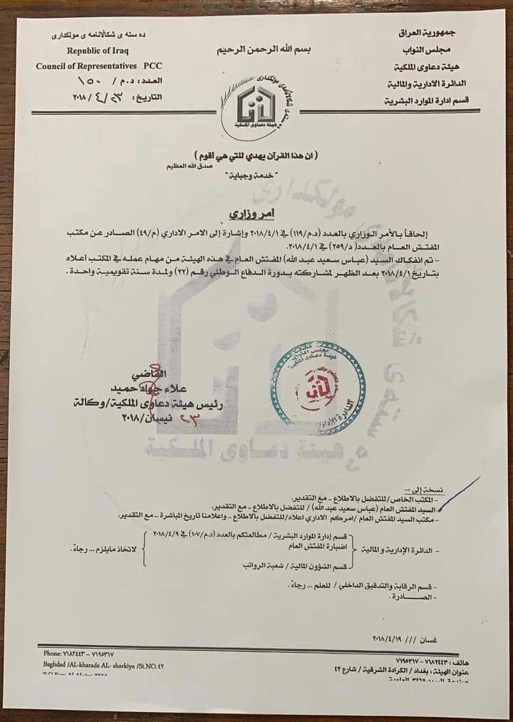 1- سبق وأن قرر رئيسي الأعلى / رئيس هيئة دعاوى الملكية إشراكي بدورة الدفاع الوطني رقم (٢٢) في كلية الدفاع الوطني بموجب أمر وزاري أصولي بناءً على ترشيح أصولي سابق وقبول أصولي سابق ، وفعلاً نفّذت الأمر والتحقت بالدورة بموجب كتاب الإلتحاق الصادر عن جامعة الدفاع للدراسات العسكرية – كلية الدفاع الوطني . وبعد سنة كاملة أنهيت دراستي شأني شأن بقية الزملاء في نفس الدورة وحصلت على شهادة الماجستير في التخطيط الإستراتيجي للأمن الوطني بتفوق عالِ وأعادتني كلية الدفاع الوطني إلى دائرتي بموجب أمر وزاري أصولي موقع من رئيس الوزراء عن / وزير الدفاع مرسل بكتاب أصولي من جامعة الدفاع للدراسات العسكرية – كلية الدفاع الوطني لغرض المباشرة بعملي شأني شأن باقي الزملاء .