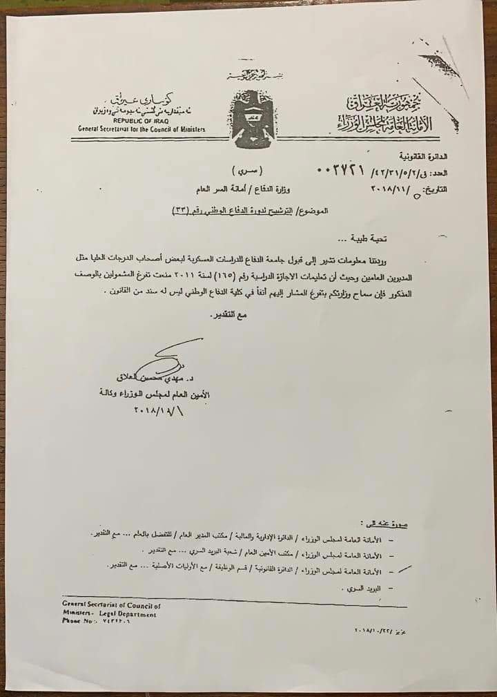 2- لم يوافق رئيسي الأعلى على مباشرتي بعملي منذ إكمالي للدورة في ١ / ٤ / ٢٠١٩ بحجة ورود كتاب من الأمانة العامة لمجلس الوزراء بعد عشرة أشهر من إلتحاقي بالدورة ينص على عدم جواز إشتراك المديرين العامين وأصحاب الدرجات العليا بدورة الدفاع الوطني ، مع العلم بأن الأمانة العامة لمجلس الوزراء نفسها قد رشحت مدراء عامين من نفس منتسبيها في ذات الدورة رقم (22) التي كنتُ مشتركاً فيها ، كذلك رشحت الأمانة العامة مدراء عامين في الدورة اللاحقة رقم (23) التي أفتتحت بضوء أخضر وبكتاب عدم ممانعة من الأمانة العامة نفسها الى كلية الدفاع الوطني لغرض قبول أصحاب الدرجات العليا ، والأمانة العامة مستمرة بترشيح المدراء العامين من منتسبيها لغاية الدورة (25) الحالية . وإن كتاب المنع المذكور لم يطبّق على بقية المشتركين بالدورات السابقة ولا على زملائي من نفس الدورة ولا على المشتركين اللاحقين في الدورات التي بعدها ولم يتم العمل به وإنما نفّذ بحقي أنا فقط . فضلاً عن إشتراك مدراء عامين ودرجات عليا وقضاة ووكلاء وزارات ومستشارون من مختلف الجهات المدنية في الدولة للدراسة في كلية الدفاع الوطني بضمنها هيئة دعاوى الملكية وهي نفس دائرتي التي أرسلتني لهذه لدورة . كون كلية الدفاع الوطني تعمل بقانون خاص هو قانون جامعة الدفاع للدراسات العسكرية رقم (4) لسنة 2016 المنشور بجريدة الوقائع العراقية بالعدد : (4400) يتاريخ 7/3/2016 حيث رسم هذا القانون آلية القبول في كلية الدفاع الوطني من المدنيين من الملاكات المتقدمة في دوائر الدولة والقطاع العام وفقاً لما جاء بالمادة -4- الفقرة /أولاً منه .