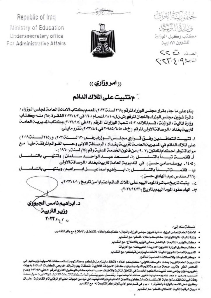 وذكرت الوزارة في بيان أن “وزير التربية صادق على تثبيت محاضري ( الرصافة الاولى) على الملاك الدائم وإعتبار مباشرتهم من تأريخ ٢٠٢٣/١/١ متمنياً لهم التوفيق في مسيرتهم التربوية”.